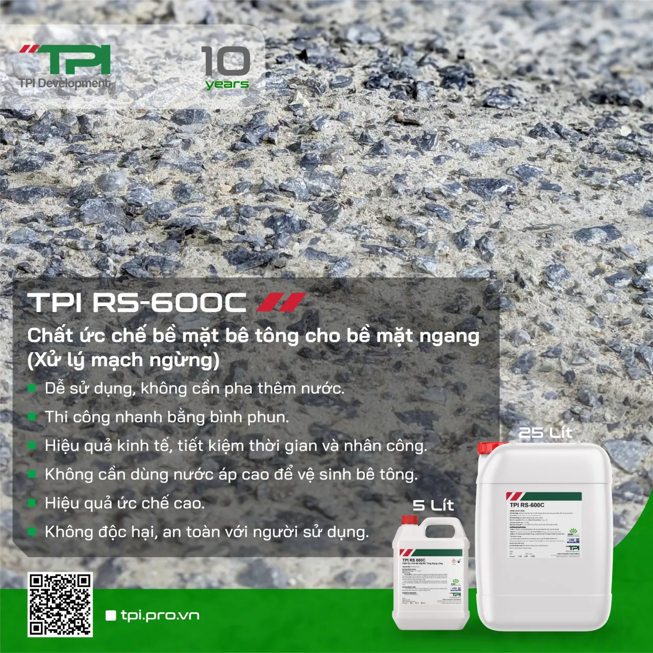 TPI RS-600C là hóa chất dạng lỏng gốc nước, được thiết kế đặc biệt để ức chế có kiểm soát quá trình ninh kết của xi măng tại lớp bề mặt (khoảng 3-5mm) của bê tông tươi.